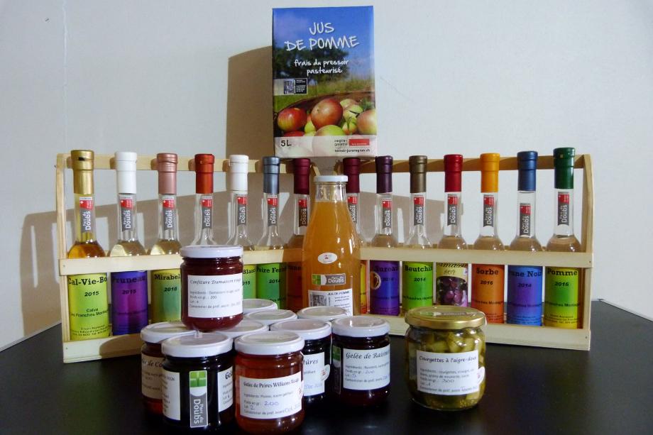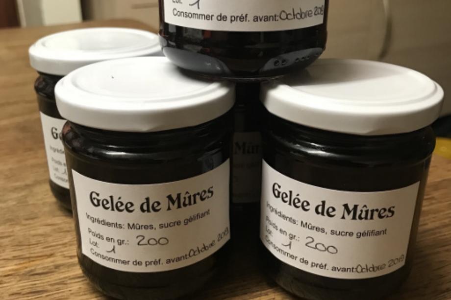 - Gelées : coings, coings-poire, poire williams rouge, poire williams jaune, raisinets, mûres, cassis, cerises, framboises, mirabelles, sureau, prunes grasses, prunes noires, damassons rouges